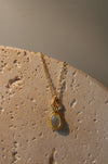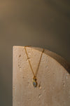 Oval aquamarine set in 18k gold with a delicate frame and fine chain.